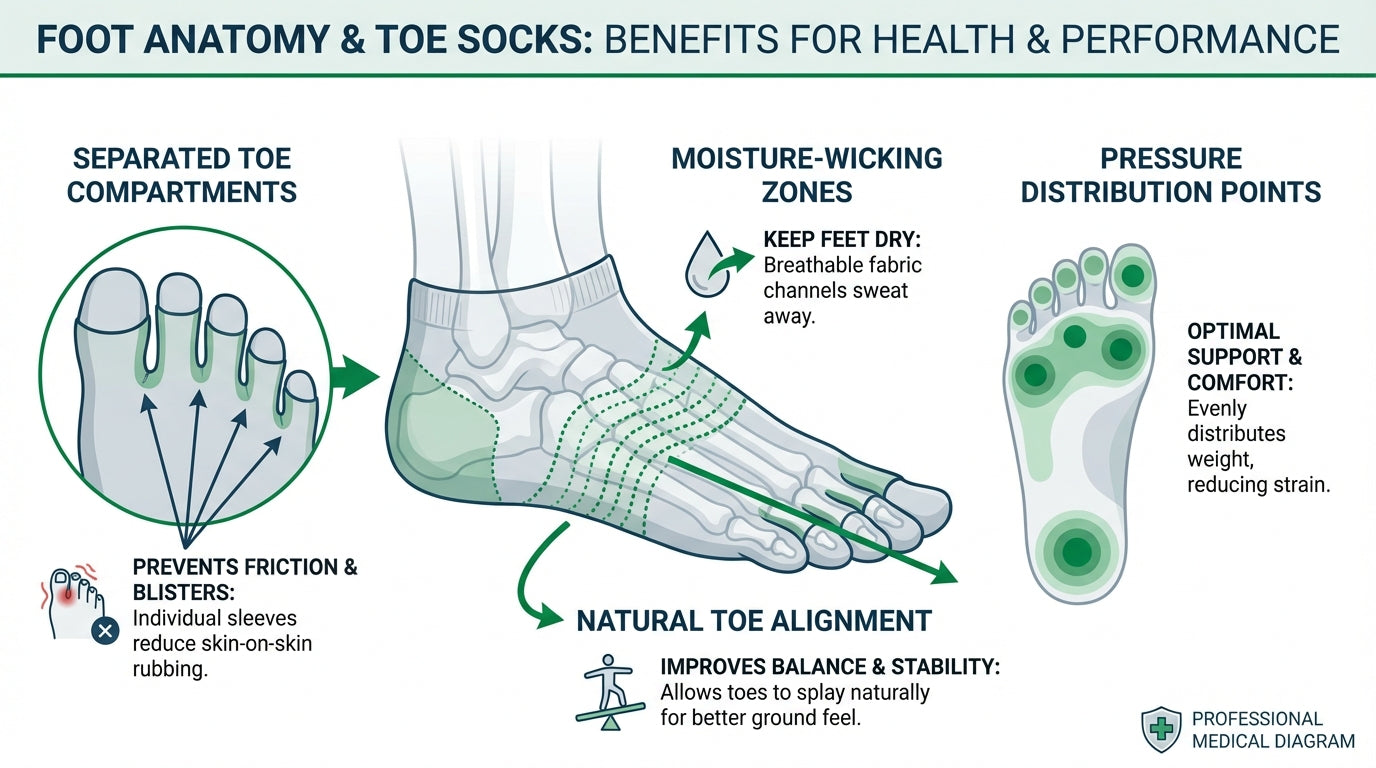 🌟 The toe separation eliminates skin-on-skin friction between your toes, which is especially important in tight work shoes during long shifts.